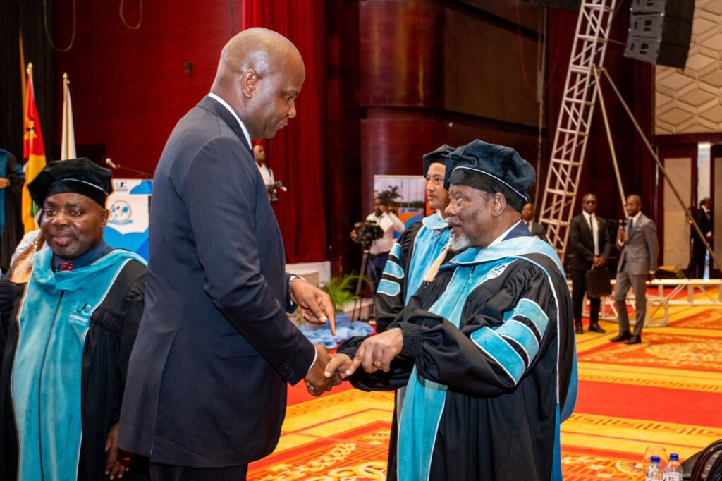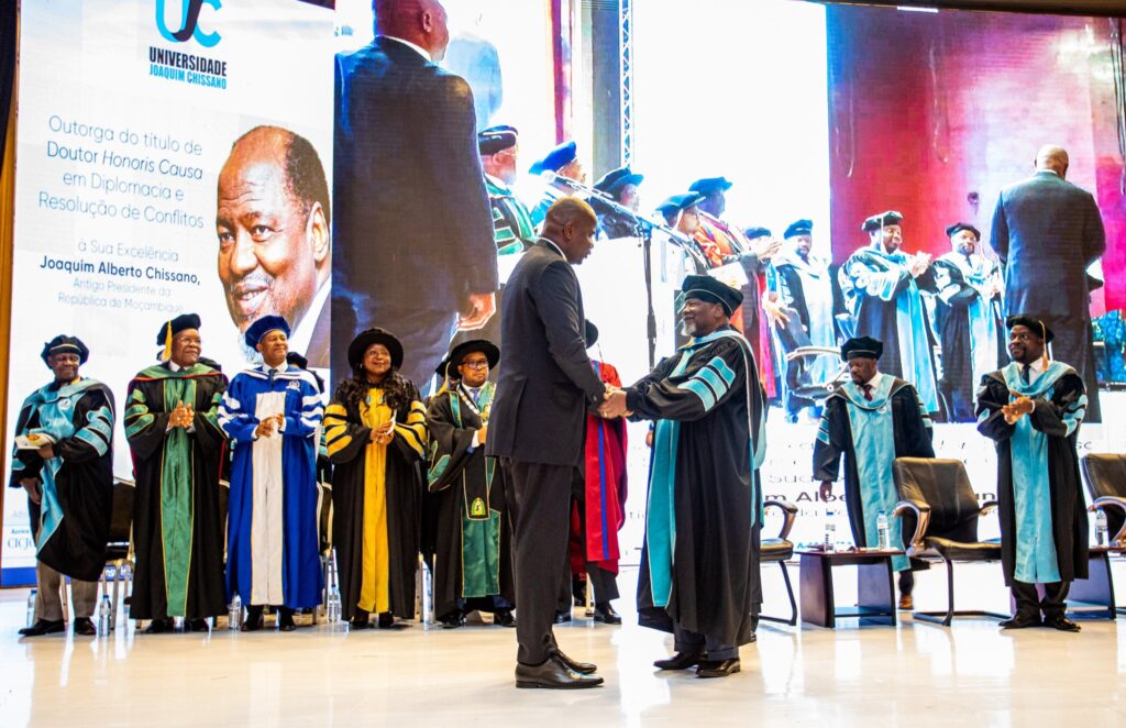 O Presidente Honorário da FRELIMO e antigo Presidente da República, Joaquim Alberto Chissano, elogiou o Chefe de Estado moçambicano, Daniel Francisco Chapo, pelos “excelentes resultados no campo diplomático alcançados em tão curto espaço de tempo”, afirmando que o actual estadista merece a sua “vénia e a mais alta honra”. As declarações foram feitas durante a cerimónia de outorga do título de Doutor Honoris Causa em Diplomacia e Resolução de Conflitos, atribuída a Chissano pela Universidade Joaquim Chissano, instituição da qual é patrono.