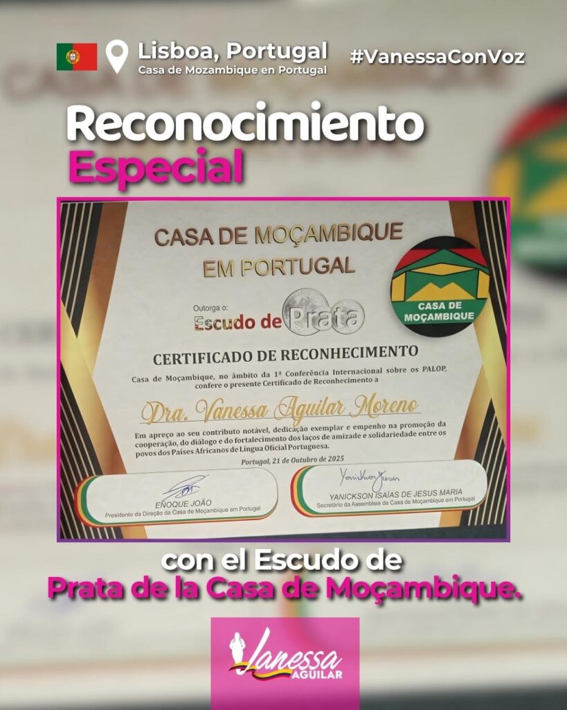 A activista e líder colombiana Vanessa Aguilar Moreno foi distinguida com o Escudo de Pratapela Casa de Moçambique em Portugal, no âmbito da1.ª Conferência Internacional sobre os Países Africanos de Língua Oficial Portuguesa (PALOP). O reconhecimento, segundo Aguilar Moreno, “transcende fronteiras e palavras” e simboliza o valor do diálogo, da cooperação e do trabalho constante pela união entre povos afrodescendentes e africanos lusófonos.